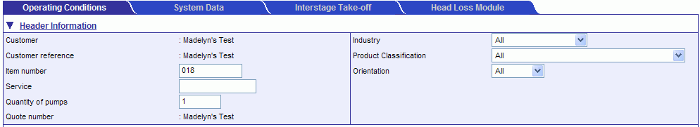 The Header Information twistie provides input fields and drop down menus. The input fields can be used to capture specific information to identify the selection, while the drop down menus provides selection options to filter the available products. The image below is an example of the Header Information twistie on the Operating Conditions tab of the Conditions of Service Page.