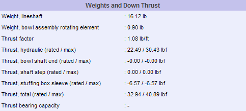 Displays the total thrust (rated, max) of the combination of the weight of lineshaft, weight of bowl assembly, hydraulic thrust, bowl end shaft thrust, shaft step thrust and sleeve box thrust.